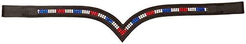 BRAND NEW V SHAPED DESIGNER WITH SPARKY CRYSTAL BROWBAND Team Gb RED/WHITE/BLUE CRYSTALS team GB ** red ** white ** blue ** Fancy Black Leather replacement english brow band with sparkling crystals ,harness lining, soft and supple real quality leather show stopper!