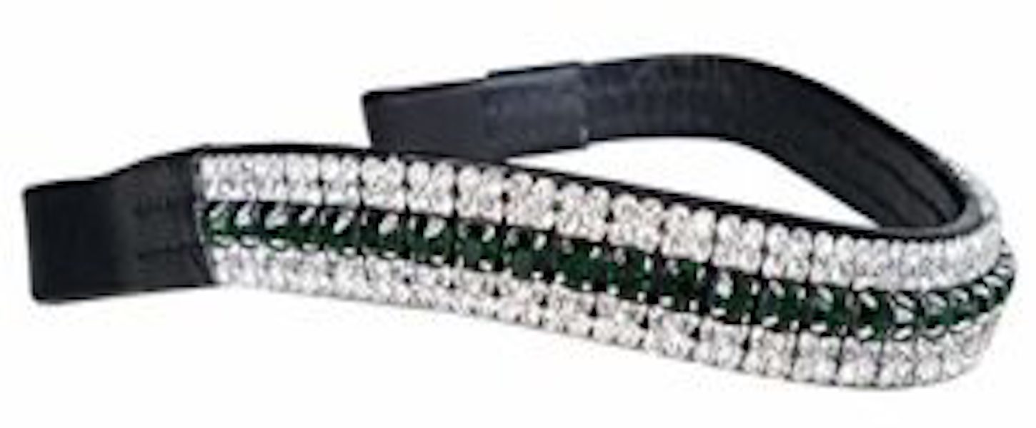 Teal Green & Clear mega bling curve browbands For the ultimate sparkle this browband is at the top of the list! With its 5 rows of crystals in a unique design it really does catch the eye with its sparkles... This crystal browband is made up with a 6mm central Teal Green crystal row, with two rows of 3mm clear preciosa crystals either side. These preciosa crystals give our crystal browbands a superior sparkle. A beautiful elegant crystal browband choice for those who love to compete dressage, showjumping or just because you love bling! This clear crystal browband has the "wow" factor!!