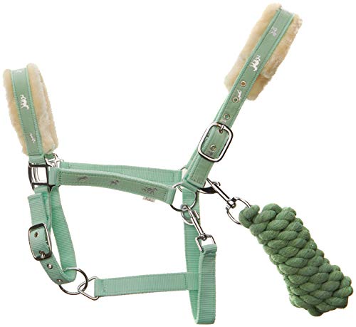 nylon fur padded horse print head collar halter set with lead ropes These headcollars are made from strong polyester and have heavy duty silver coloured buckles and fittings. The headcollar is covered in a ribbon-type material that is decorated with a mare and foal motif in a silvery coloured stitching. The headcollars have thick padding that is fleecy and extra soft. The padding is around the noseband and the poll, providing padding in delicate areas. comes with matching lead rope approx 2 meters . colour MINT GREEN SIZE- FULL/COB/PONY