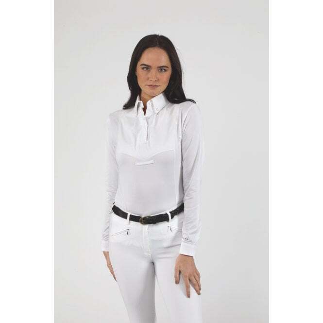 Shires Aubrion Womens Long Sleeve Tie Shirt - White. Feel confident while staying comfortable at competitions with this long sleeve tie shirt. Style detail: smart cotton front panel, button down collar, tie keeper, button cuffs, stretch shirt, AIR DRI moisture technology fabric, Aubrion prints.