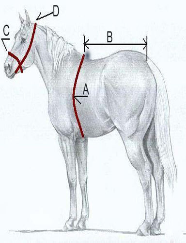 D: Bridle, from bit ring to bit ring over poll. Subtract 3 inches if measuring from corner of mouth to corner of mouth as bit rings are usually 1-1/2 inches each side.
