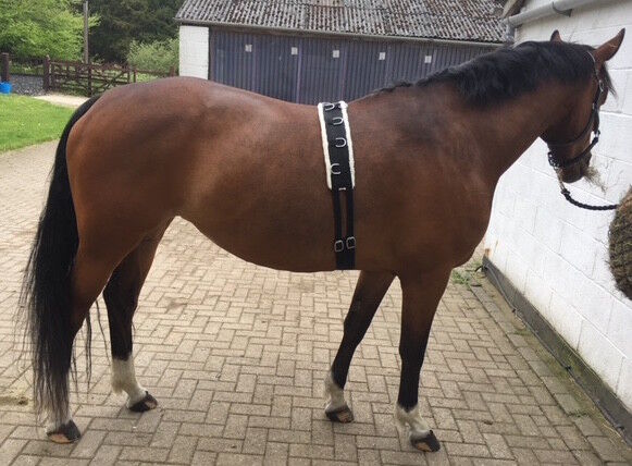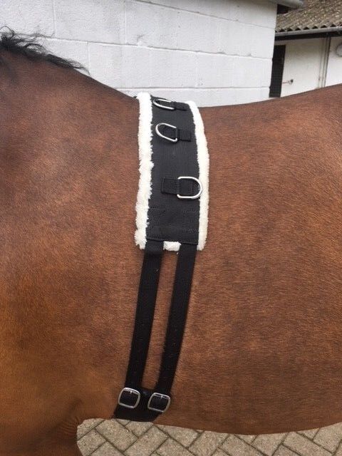 This is high end best quality synthetic pp nylon FLEECE padded lunge roller with D rings and a girth that is adjustable on both sides or totally removable. Best quality synthetic cardura is used in this body roller with padding on the back for extra comfort .